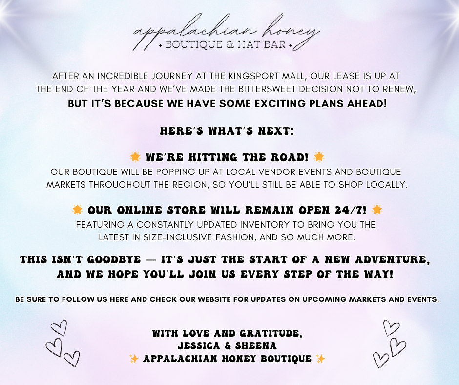 After an incredible journey, we say goodbye to our Kingsport Mall location on December 29th to take our gig on the road. Don't forget you can still shop online 24/7.